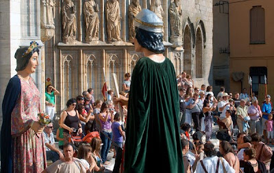 A katalán nemzeti ünnep alkalmából, amely Barcelonában majd Centellesben 2 éve még megdöbbentő csendet jelentett, itt hatalmas rendezvénysorozatot, középkori játékokat, mulatságot - tehát semmiképpen sem csenddel ünnepelnek. A legnagyobb rendezvény Castelló d'Empúries-ben a Terra de Trobadors volt, ravaszul el is mentünk időben és még a legutolsó parkolóhelyet megcsíptük utánunk már a mezők felé terjeszkedhettek csak...feldíszített város, "középkori" piaccal és mesterségekkel